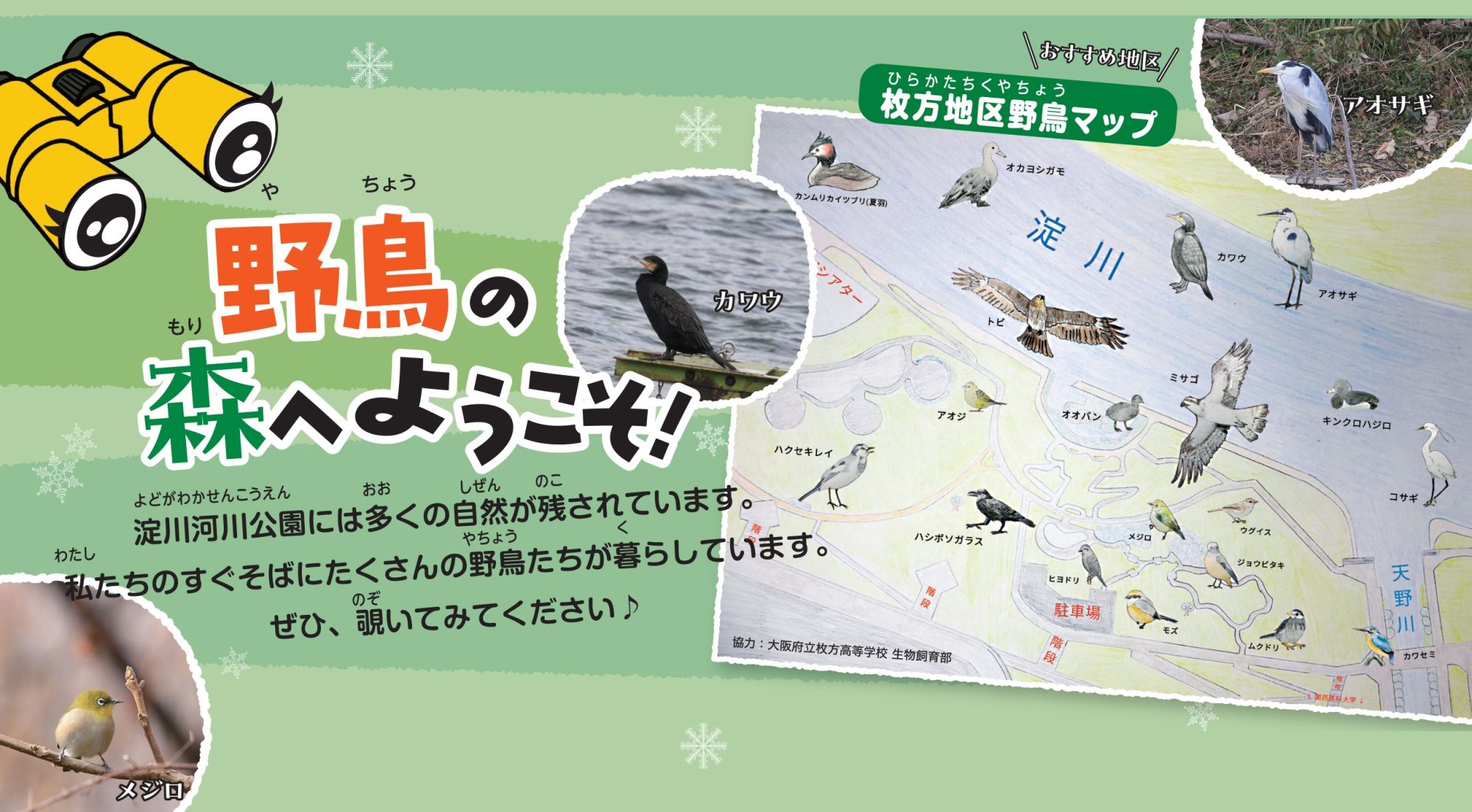 冬の淀川河川公園は野鳥の宝庫♪ 冬の時期しか観察できない野鳥や淀川を住処にしている野鳥、、など様々な野鳥の姿を見つけることが出来ます。野鳥観察のイベントもたくさんあるよ!ぜひ、チェックしてみてね♪